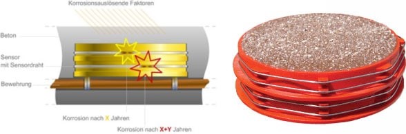 Die Korrosionsmessung basiert auf dem Prinzip der Stellvertreterkorrosion: Die Sensoren verfügen über zwei redundant ausgeführte Messebenen, deren Materialeigenschaften denen des Betonstahls nachempfunden sind. Wird eine dieser Ebenen durch Korrosion beschädigt, liefert dies ein verlässliches Signal über den Beginn bzw. das Fortschreiten der Korrosionsfront.